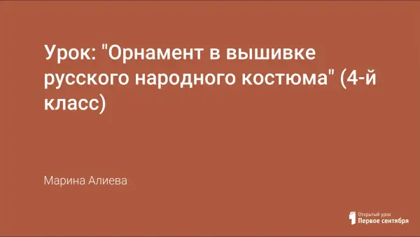 Целью урока изобразительного искусства в 4-м классе было знакомство с русской народной вышивкой. Большое внимание в своей работе на уроках я уделяю духовно-нравственному воспитанию. Хотелось показать девочкам красоту отношения человека к труду. Материал этого урока нацелен на приобщение учениц к истокам народного искусства и художественных представлений нашего народа.