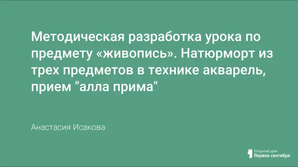 Цель урока: написать несложный натюрморт из трех предметов, помещенных в сильную цветовую среду в технике акварель, используя прием «алла прима».