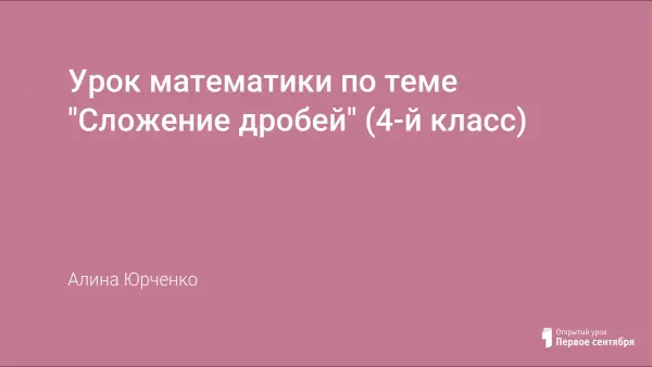 Цели: сформировать способность к сложению дробей с одинаковыми знаменателями; способствовать развитию памяти, речи; умения самостоятельно применять знания; воспитывать чувство взаимопомощи, прививать любовь к математике. Урок открытия новых знаний, где дети самостоятельно в группе пытаются решить задачу нового вида на сложение дробей с одинаковыми знаменателями, вывести правило.