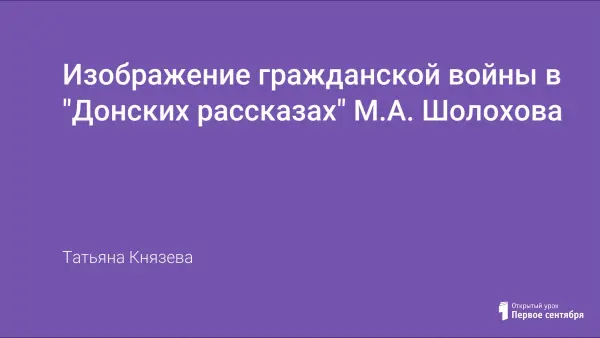 Урок построен с использованием мультимедийной презентации. Основные цели урока: изучить "Донские рассказы" М.Шолохова, выявить концепцию гражданской войны в ранних произведениях М.Шолохова на примере рассказов "Родинка", "Чужая кровь"; повторить и систематизировать знания учащихся по теме "Гражданская война"; определить тему и идею рассказов; особенность языка и стиля рассказов; формировать умение самостоятельно работать с художественным текстом.