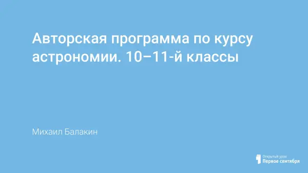 Авторская программа курса астрономии рассчитана на два года (10-й и 11-й классы, 1 час в неделю). Программа интегрирована с курсом физики в большей степени, чем ранее существующие: все темы астрономии изучаются в приблизительно одинаковые сроки с соответствующими темами физики, некоторые темы изучаются только в курсе астрономии (движение в поле сил тяготения и гравитационные маневры, магнитное поле Земли, спектральный анализ).