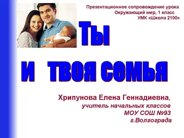 Урок является первым уроком по теме. Дается информация о том, что самое дорогое у человека – это его семья, что членов семьи связывают любовь, нежность, забота друг о друге. Урок сопровождается мультимедийной презентацией. Включение в урок иллюстративного ряда фотографий способствует эмоциональному восприятию значимых для ребенка моментов (чувств, объединяющие членов семьи). Опорная схема, которая составляется по ходу урока, позволяет обучающимся зафиксировать полученное на уроке новое знание.