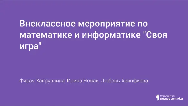 Цель интегрированного внеклассного мероприятия «Своя игра» – повышение интереса учащихся к предметам математики и информатики, расширение круга знаний по предметам. Задания составлены с учетом знаний учащихся 8–10-х классов. Вопросы различны: и вычислительные, и из истории математики и информатики, и на смекалку и т.д.
