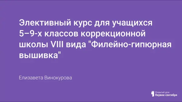 Курс "Технология (филейно-гипюрная вышивка)" предложен как один из вариантов подготовки учащимся школ VIII вида и коррекционных классов к самостоятельной жизни. Он может рассматриваться как один из способов решения задачи обучения умственно отсталых детей видам полезного проведения досуга, в данном случае вышивка салфеток. Цель курса – пропедевтика основных понятий об орнаменте и технологических основах филейно-гипюрной вышивки.