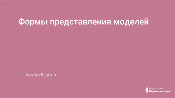 Целью урока является формирование знания об основных формах представления моделей, выборе оптимальной формы представления моделей в зависимости от условий задачи. Объяснение новой темы построено на основе мультимедийной презентации. В разработке показаны как основные формы представления моделей, так и формы представления моделей, не рассматриваемые с позиции способов моделирования.