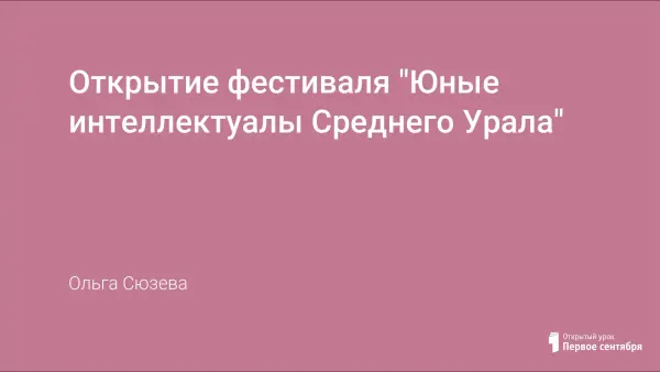Открытие фестиваля "Юные интеллектуалы Среднего Урала" является стартом фестивального движения в школе. На празднике обозначаются основные направления этого движения, помогающие детям раскрыть свои способности. Каждый класс ставит номера художественной самодеятельности, оформляет выставки работ и т.д. Таким образом, каждый ребенок чувствует свою значимость, окрыленность.