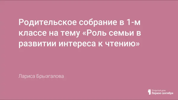 В работе представлены цель, задачи, вопросы для обсуждения по теме собрания. Цель: обобщение читательского интереса первоклассников. Показано, как можно провести родительское собрание, используя групповую форму работы. Итог собрания – презентация с рекомендациями для родителей, которую может составить классный руководитель.
