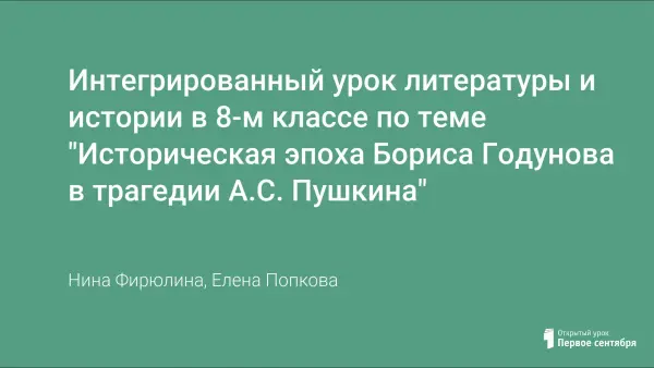 Данный урок является примером творческого сотрудничества учителей литературы и истории и объединяет литературоведческий и исторический взгляд на произведение А.С. Пушкина "Борис Годунов", поднимаемые в нём проблемы, решает задачи обучения анализу художественного произведения.