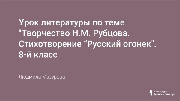 Урок проводится в школьном краеведческом музее в комнате "Русская изба", где стоит русская печь, стол, покрытый кружевной скатертью, на столе - большой самовар, на деревянных стенах избы - фотографии в больших рамках, в каждой рамке от 6 до 10 фотографий. Цель урока: познакомить с творчеством Н.Рубцова, учить понимать и любить поэзию, воспитывать любовь к Родине, способствовать привитию лучших моральных качеств русского народа.