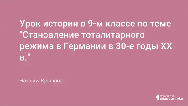 На изучение темы «Становление тоталитарных режимов в Европе в 30-е годы ХХ века» в курсе 9-го класса отводится всего 2 часа, поэтому очень важно сделать их запоминающимися. На данном занятии выявляется сущность идеологии нацизма, раскрывается понятие национальной и расовой дискриминации, доказывается, что в Германии 1930-х установился тоталитарный режим.