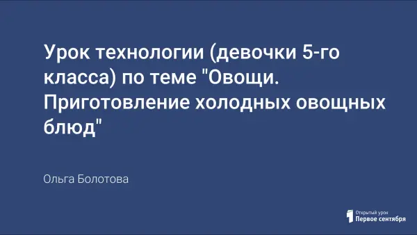 Этот урок дает представление о пищевой ценности овощей, большом значении их в питании человека. Воспитывает трудолюбие, потребность в творческом труде, аккуратность, заинтересованность в конечном результате труда.