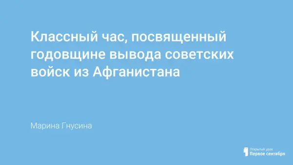 Цель классного часа познакомить учащихся с основными фактами из истории Российской Армии на примере Афганской войны 1979–1989 гг., отметить память даты вывода Советских войск из Афганистана. Мероприятие проводится в форме литературно-музыкальной композиции. В течение урока зачитываются отрывки из литературных произведений, декламируются стихи о войне в Афганистане. Заканчивается классный час минутой молчания.