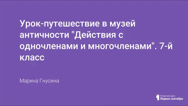 Урок построен на межпредметной связи уроков математики, литературы и истории и МХК. На уроке учащимся предлагается совершить путешествие в античный музей и познакомиться с героями античности. Каждый этап экскурсии сопровождается заданиями по выполнению действий над одночленами и многочленами. Каждый участник путешествия обеспечивается билетом (картой экскурсии), где отмечаются все ответы на поставленные в ходе урока вопросы. На уроке используется презентация, которая позволяет переходить с одного этапа путешествия на другой с гиперссылками.