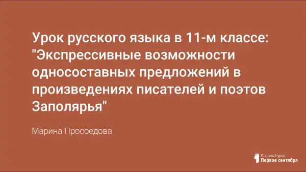 Урок посвящен изучению видов односоставных предложений в лирике мурманских поэтов. Используются различные педагогические приемы: "Эпиграф", "Погружение", "Отсроченная отгадка", "Лови ошибку", "Опрос", "Повтор с расширением", "Согласен – не согласен".