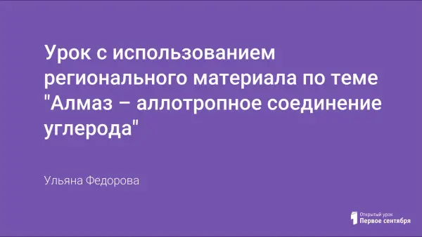 Региональный материал подается с использованием информационной технологии. На данном уроке по справочным материалам, проведя лабораторную работу, учащиеся самостоятельно знакомятся с физическими свойствами алмаза и графита. Урок даёт представление о полной взаимосвязи человека и природы; об ответственности человека за окружающий человека мир природы. Воспитывает чувство патриотизма.