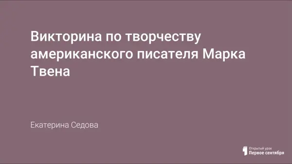 Викторина предназначена для обучающихся 5–6-x классов, изучающих английский язык. Данная викторина представляет собой игру, которая проводится по аналогии с интеллектуальной игрой «Брейн-ринг» и позволяет проверить знания учащихся о жизни и творчестве М.Твена и повысить познавательный интерес к изучению английского языка.