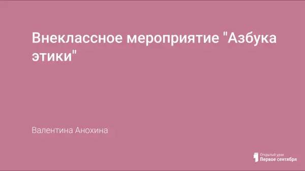 В мероприятии четко прослеживаются две структурные части, отражающие правила поведения за столом и в театре. Инсценирование жизненных ситуаций в рамках обозначенной темы делает данное мероприятие интересным, нетрадиционным. «Азбука этики» разработана на основе литературных произведений и специальной литературы.