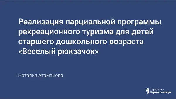 Парциальная программа дошкольного рекреационного эколого-оздоровительного туризма «Веселый рюкзачок» рассчитана на детей 5–7 лет. Содержание программы направлено на развитие двигательной и познавательной активности дошкольников, формирование у них осознанного отношения к здоровью, ценностного отношения к природному и социальному окружению.