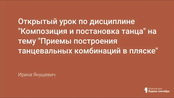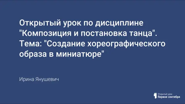 Урок выстроен в структуре компетентностного подхода к обучению с уклоном в хореографическую деятельность. Использование информационно-коммуникативных технологий способствует расширению и углублению знаний по данной теме. Цель урока – создание психолого-педагогических условий формирования у студентов методической готовности к созданию хореографического образа в миниатюре.