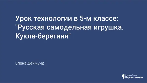 Данный урок входит в раздел "Материаловедение" по программе 5-го класса. Основная идея – знакомство с традициями, обычаями русского народа. Объяснение материала сопровождается показом видеоролика, компьютерной презентации. Дети наглядно знакомятся с видами и назначением тряпичных кукол, повторяют приёмы работы с иглой, технику безопасности, а также свойства хлопчатобумажных тканей.