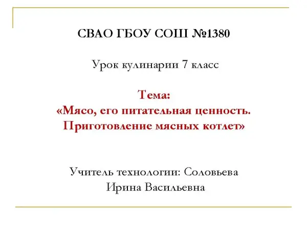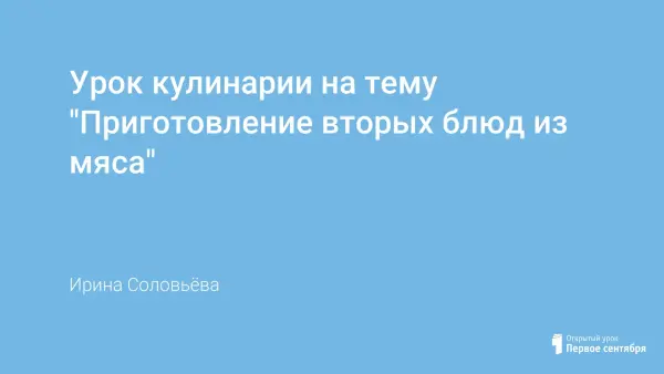 Урок знакомит учащихся с питательной ценностью мяса, его видами, содержанием необходимых пищевых веществ для нормальной жизнедеятельности и развития человеческого организма. Прививает навыки приготовления вторых блюд из мяса.
