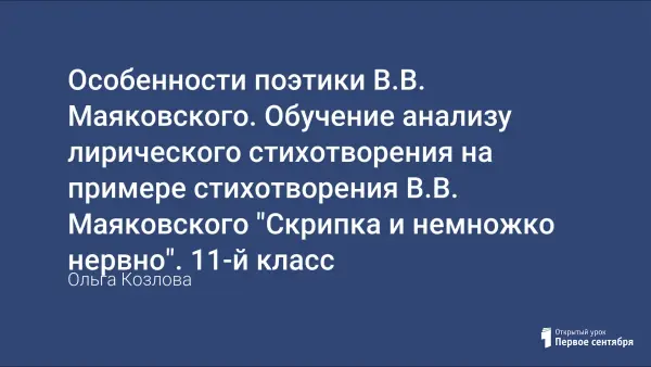В структуре данного урока особое внимание уделяется формированию у учащихся знаний об особенностях ранней лирики В.В. Маяковского на примере анализа стихотворения «Скрипка и немножко нервно». В ходе урока учащиеся составляют психологический портрет лирического героя стихотворения и знакомятся с проблематикой, характерной для произведений раннего периода творчества поэта.