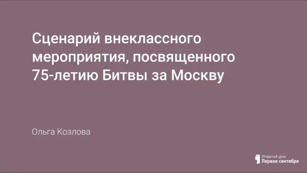 Сценарий внеклассного мероприятия посвящен 75-летию Битвы за Москву — одному из самых масштабных сражений, повлиявших на ход Великой Отечественной и Второй мировой войны. Здесь, у порога столицы нашей Родины, впервые потерпели серьёзное поражение гитлеровские армии, прошедшие победоносным маршем половину Европы. Участие в мероприятии способствует воспитанию социально-активного человека, гражданина и патриота России; развивает у обучающихся интерес к истории страны.