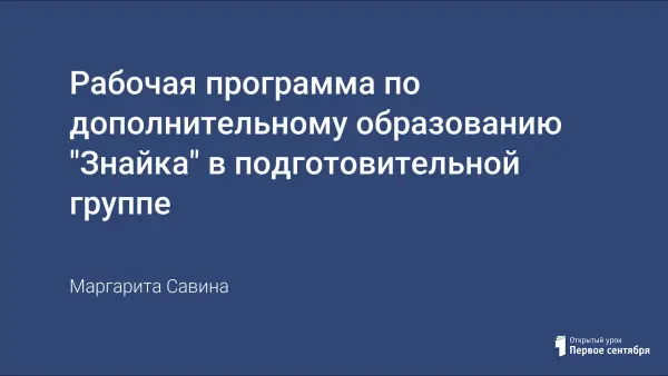Рабочая программа «Знайка» направлена на общеинтеллектуальное развитие обучающихся. Программа кружка «Знайка» представляет систему интеллектуально-развивающей образовательной деятельности для обучающихся подготовительной группы. Программа реализована в рамках совместной образовательной деятельности в соответствии с ФГОС. Программа «Знайка» является интегративной, объединяющей знания, входящие в образовательные области: социально-коммуникативное развитие, познавательное развитие, речевое развитие, художественно-эстетическое развитие, физическое развитие.