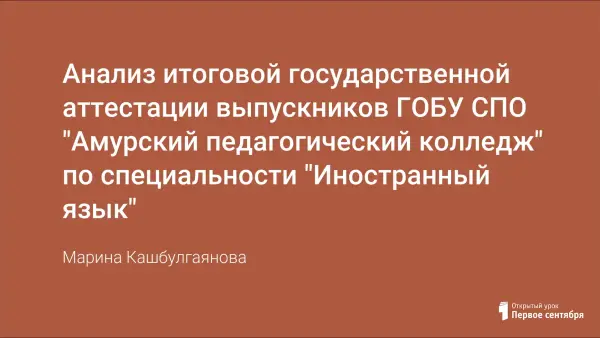 В статье дан анализ проведения государственной аттестации выпускников ГОБУ СПО «Амурский педагогический колледж» по специальности 050303 52 иностранный язык (очная и экстернатная формы обучения) и дана объективная оценка уровня сформированности профессиональных компетенций выпускников данной специальности.