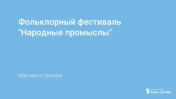 Представлен сценарий фольклорного фестиваля. Начинается с рассказа о народных промыслах России с сценками, видеосюжетами и презентацией. Проводятся народные игры и тематические конкурсы.