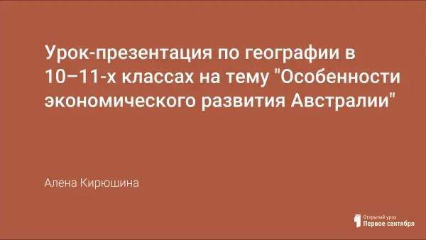 Урок знакомит учеников 10–11-х классов с особенностями экономического развития Австралии как развитого государства мира. Урок разработан в соответствие с типовой характеристикой страны и с использованием информационных технологий. В ходе урока предлагаются развивающие задачи, позволяющие закрепить полученные знания.