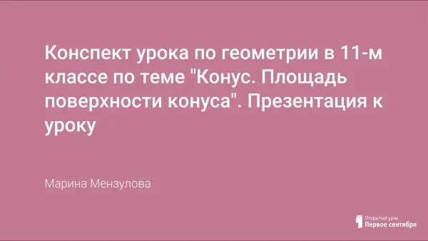 Разработка представляет собой конспект урока и презентацию к уроку, которые учитель может использовать при изучении темы "Конус" в 11-м классе (второй урок в данной теме).