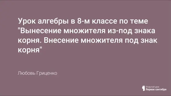 Урок изучения нового материала, ознакомления с этапами исследовательской работы. Урок нацелен на формирование умений учащихся выносить множитель из-под знака корня и вносить множитель под знак корня на простейших примерах. Форма урока - игровая.
