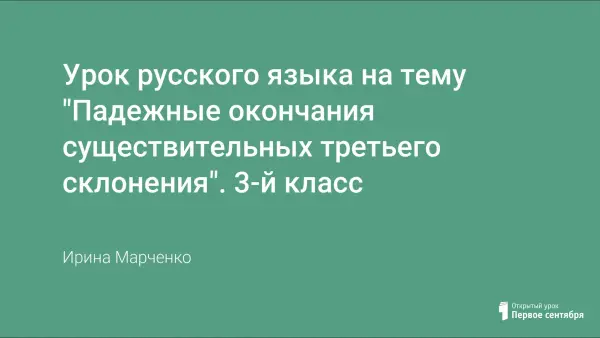 На основе многолетнего опыта работы автора по системе Л.В.Занкова, предложен план урока русского языка в 3-м классе «Падежные окончания существительных 3 склонения». Изучая русский язык, учащиеся знакомятся с музыкальными, художественными произведениями. На уроке используются различные виды работ, что способствует всестороннему развитию ребенка.