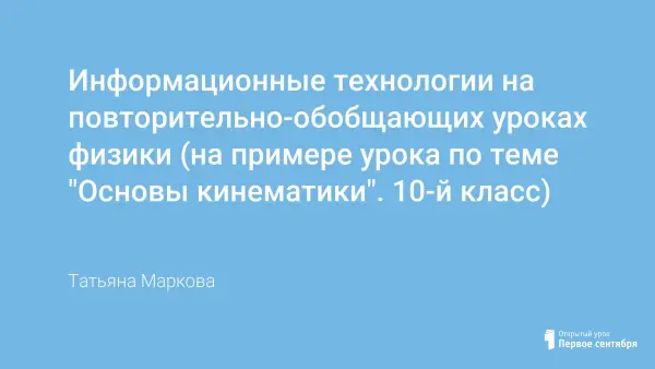 В работе раскрываются организационно-методические аспекты использования ИКТ в учебном процессе. Представлен конспект урока, показывающий приемы организации повторительно-обобщающего урока в 10-м классе по теме «Основы кинематики». В качестве приложения приведены дидактические материалы (презентация, карточки заданий с решениями, вопросы для повторения с ответами).