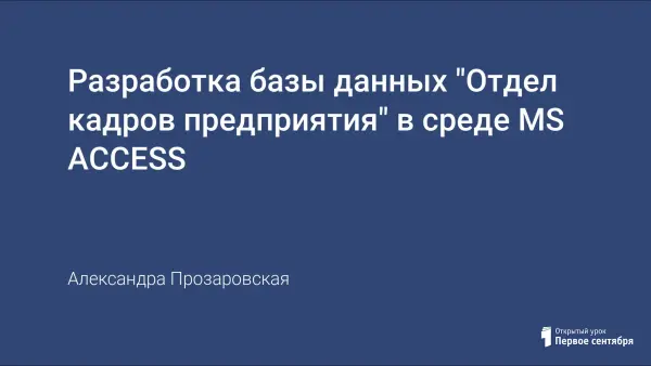 Представленный урок (2 академических часа) является продолжением опубликованного на сайте в 2010/11 году занятия «Нормализация баз данных» и рассчитан на учащихся 3-го курса среднего профессионального образования по дисциплине «Информационные системы и базы данных» (по специальности 050202 «Информатика»). Это занятие поможет учащимся разработать базу данных «Отдел кадров предприятия» в среде MS Access.