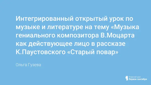 На уроке дети приобщаются к сокровищам мировой культуры, знакомятся с биографией В.Моцарта и его произведениями, узнают один из способов раскрытия авторской позиции в тексте рассказа К.Паустовского "Старый повар", совершенствуют навыки работы с текстом.
