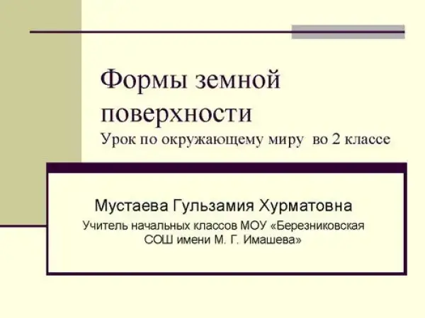 Презентация используется при изучении нового материала для знакомства детей с понятиями основных форм земной поверхности. Прекрасно подходит для раскрытия темы. Поможет учителю провести наглядный урок, учащимся ‒ открыть новые знания. Работа носит информационный и иллюстрационный характер.