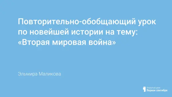 На данном занятии ученики обобщают пройденный материал по Второй мировой войне, закрепляют знание конкретных событий, дат, дополнительного информативного материала с помощью разных познавательных заданий. Для наглядности используются информативные таблицы и схемы. Через самостоятельность суждений учащиеся вовлекаются в активный творческий познавательный процесс.