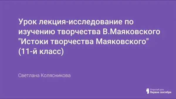 На уроке старшеклассники знакомятся с истоками творчества Маяковского-футуриста, анализируют факты автобиографии, ранние стихи поэта, статьи сборников манифестов.