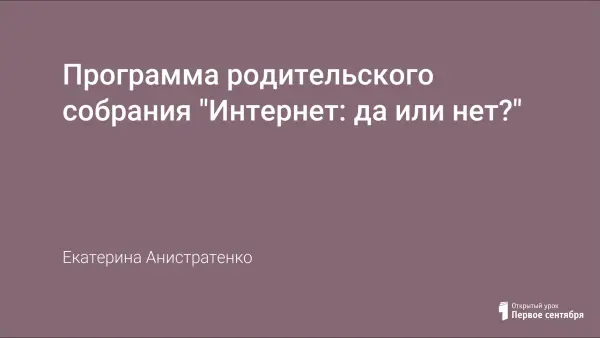 Программа родительского собрания состоит из трех частей: достоинства Интернета», недостатки, действия родителя. В первой части родителям сообщается информация о том, почему интернет так популярен в подростковой среде. Во второй части родители отвечают на вопросы анкеты и тут же узнают, есть ли опасность Интернет-зависимости для их детей; знакомятся с другими опасностями в сети. Третья часть содержит рекомендации по профилактике Интернет-зависимости.