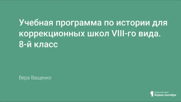 Учебная программа по истории для учащихся 8-го класса коррекционных школ VIII-го вида включает учебно-тематический план, почасовое планирование, примерные измерительные материалы, методические материалы к оценке знаний, умений и навыков школьников, список литературы для учителя и учеников.