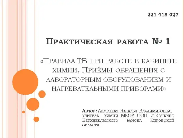 "Практическая работа № 1. Правила техники безопасности при работе в кабинете химии. Приемы обращения с лабораторным оборудованием и нагревательными приборам". 8-й класс