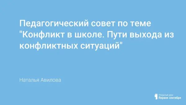 Педсовет знакомит педагогов с понятием конфликта. Изучается его влияние на микроклимат в школе, возможные формы проявления. Выявляются особенности поведения конфликтной личности, существующие способы разрешения конфликтов. Педсовет сопровождается мультимедийной презентацией и видеоматериалами, что способствует актуализации получаемой информации.