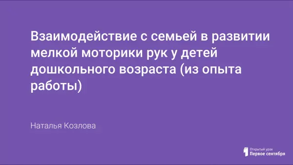 Вашему вниманию предлагается опыт работы по развитию у детей мелкой моторики рук во взаимодействии с семьей. Целенаправленная и систематическая работа по данному направлению способствует формированию интеллектуальных способностей, речевой деятельности, а самое главное, сохранению психического и физического развития ребенка.