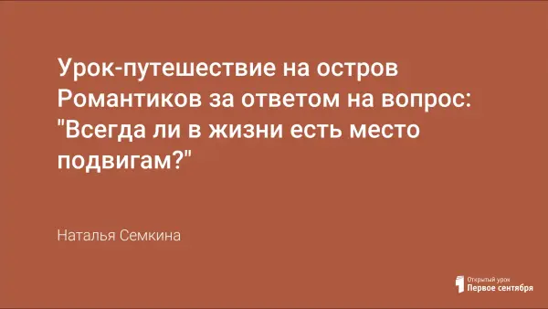 Данный урок литературы представлен в форме путешествия на остров Романтиков. Дидактическая цель поставлена игровой задачей, а учебный материал используется в качестве её средства. В процессе игры учащиеся повторяют литературоведческие понятия, работают с текстом легенды.