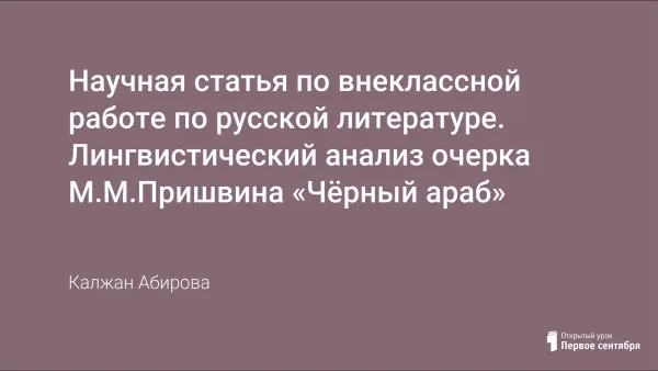 Цель исследования: лингвистический анализ очерка М.М.Пришвина «Чёрный араб». Наверное, нет такого писателя, у которого слово так естественно входило бы в порядок обыденной жизни. Наверное, поэтому в нём никак не могли узнать «ученого поэта, философа», полагая его то этнографом, то детским писателем. Я был он самой природой и достигал с ней такого единения, что казалось, что это он уже пишет, а через него говорят о своём звери и птицы, реки и муравьи, сосны и водопады, степи и ветры.