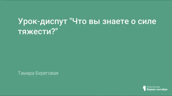 Урок-диспут проходит в 10-м классе как урок-повторение закона всемирного тяготения, силы тяжести, второго закона Ньютона в необычной для детей форме. Постановка проблемы в виде вопроса: "Верите ли вы тому, что написано в статье?" – заставляет их критически относиться к получаемой информации, развивает аналитическое мышление, учит делать выводы путем логических рассуждений.