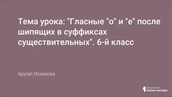Урок знакомит учащихся с новой орфограммой: буквы "о", "е" после шипящих в суффиксах существительных. Объясняется, как правильно обозначать орфограмму; обобщается правописание "о", "е" после шипящих в корне, окончании.