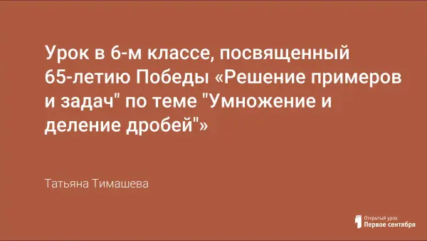 Урок «Решение примеров и задач» по теме «Умножение и деление дробей» – урок обобщения и систематизации знаний с использованием исторического материала, посвященного Великой Отечественной войне. Все задания, которые решаются на протяжении урока, связаны с самыми яркими этапами Великой Отечественной войны.
